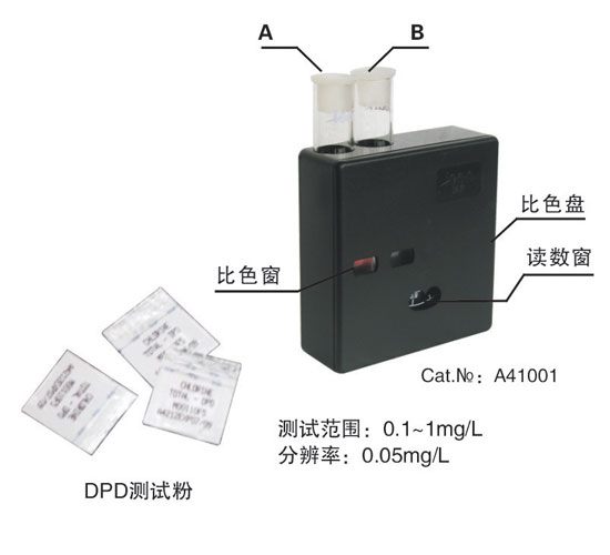 ·測試方法: 在A、B試管中各加5ml被測臭氧水,立即在B試管中加一小包DPD測試粉,水立刻變紅色, 轉(zhuǎn)動比色盤比較兩視窗顏色, 達(dá)同樣色度時,在讀數(shù)窗口讀出數(shù)據(jù), 即為水中的臭氧濃度。